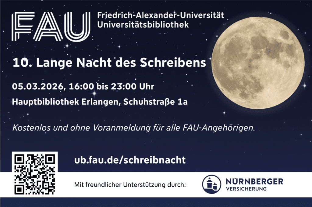 Die nächste "Lange Nacht des Schreibens" findet am Donnerstag, 05.03.2026, von 16:00 Uhr bis 23:00 Uhr in der Hauptbibliothek Erlangen statt. Einige ausgewählte Kurse werden nur online angeboten. Die Teilnahme ist kostenlos und ohne Voranmeldung möglich.