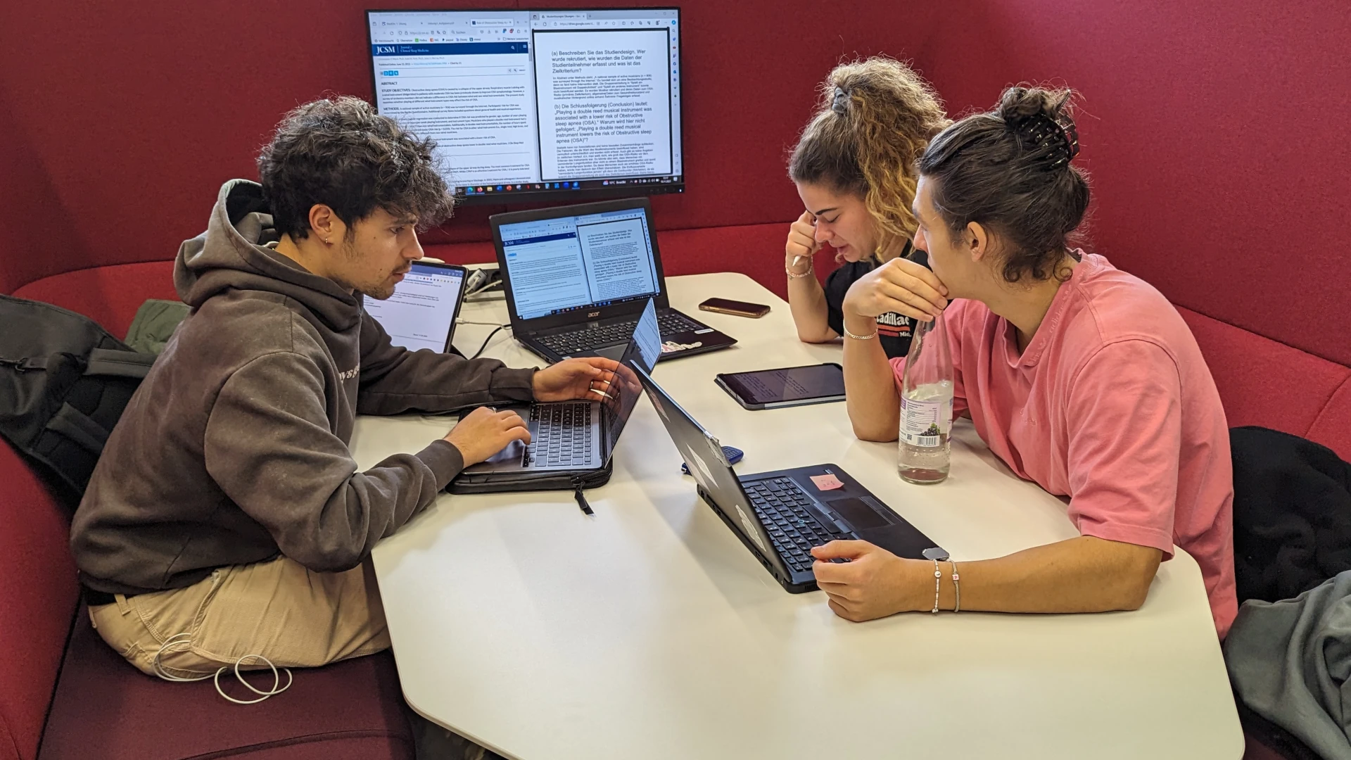 Sie möchten in der Gruppe lernen und gemeinsam an Texten und Präsentationen arbeiten? An den Team-Monitoren in der Universitätsbibliothek können Sie den Bildschirm Ihres Laptops auf einem großen Wandmonitor teilen und Inhalte präsentieren.