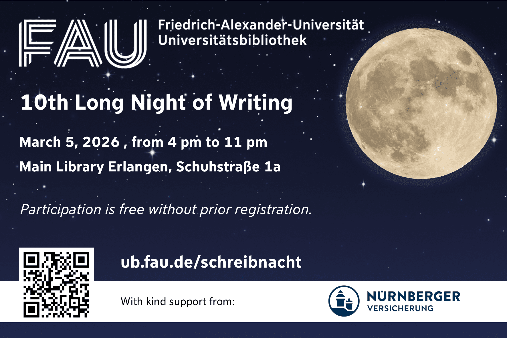 Directly to the event platform To the writing consultationsThe Long Night of Writing is organized by the University Library in collaboration with the the Writing Centre at the Language Centre (SZ), the FAU Competence Center for Interdisciplinary Scientific Reflection (ZIWIS), the Student Committee of the Faculty of Humanities, Social Sciences, and Theology (FSV Phil), the Student Representation (Stuve) as well as the Career Service and the Sponsor NÜRNBERGER Versicherung.